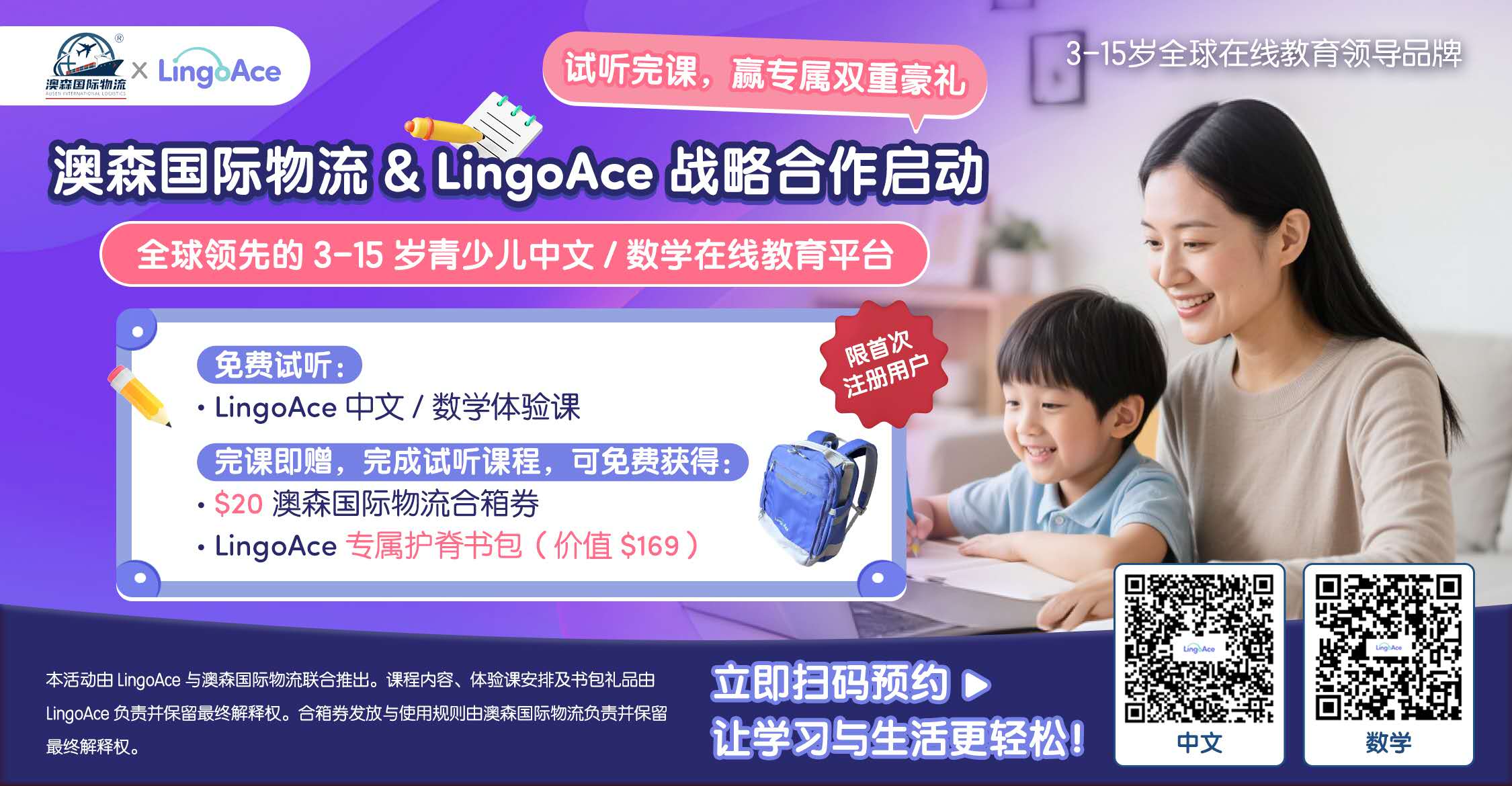 澳森国际物流 携手 LingoAce(3-15岁全球在线教育领导品牌),共同打造 “教育-生活” 优惠联盟,为您和您的孩子带来学习与生活的双重升级体验!